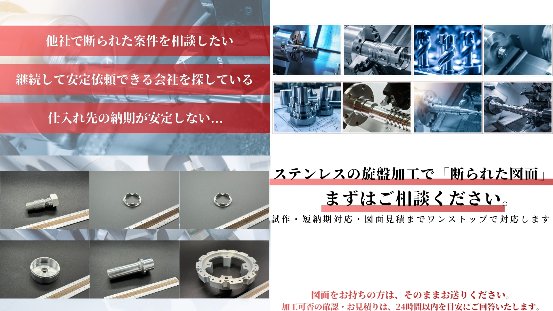 「精度が出ない」「納期が間に合わない」「小ロット対応してくれる業者が見つからない」といった課題に対し、ステンレスの旋盤加工に特化した加工体制で、品質・スピード・コストの最適解を提供します。